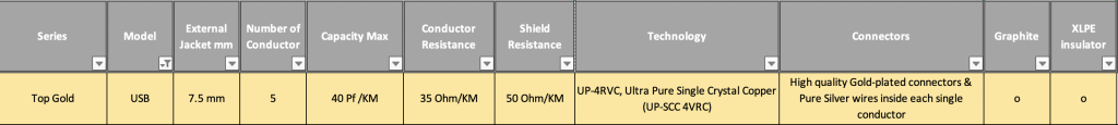Technical characteristics: External jacket mm: 7,5 mm; Number of Cond: 5; Copper: (UP-4VRC) (Ultra Pure Single Crystal Copper) (UP-SCC 4VRC)/ Graphite and Silver for each wire; Capacity Max: 40 Pf /KM.; Conductor Resistance: 35 Ohm/KM; Schield Resistance: 50 Ohm/KM.