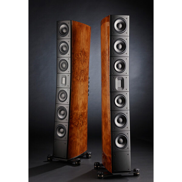 Size (WxHxD): 200 x 1550 x 600 mm (440 x 1580 x 600 mm incl. feets) Weight: 65 Kg Freq. reponse 25 Hz – 50 KHz Impendance: >6 ohm Sensitivity: 89 dB 2.828 V/m Crossover: 2.5 kHz; Stepped slope, phase and impulse linear Enclosure: Ported Drive units: 1 x Sealed TD Ribbon tweeter 2 x 110 mm Tantalum-Diamond mid-range drivers 4 x 115 mm Tantalum-Diamond bass drivers Finish: Black piano; All possible paint colors; Walnut burl veneer Amplification: >20 W (Though we have seen excellent results with small tube amplifiers)